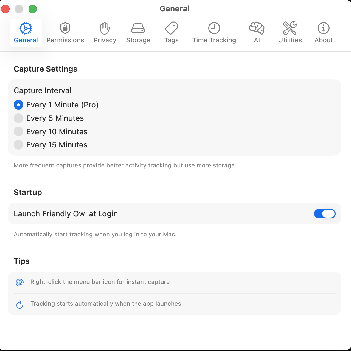 Tune capture cadence, startup behavior, and the everyday defaults that keep tracking invisible.