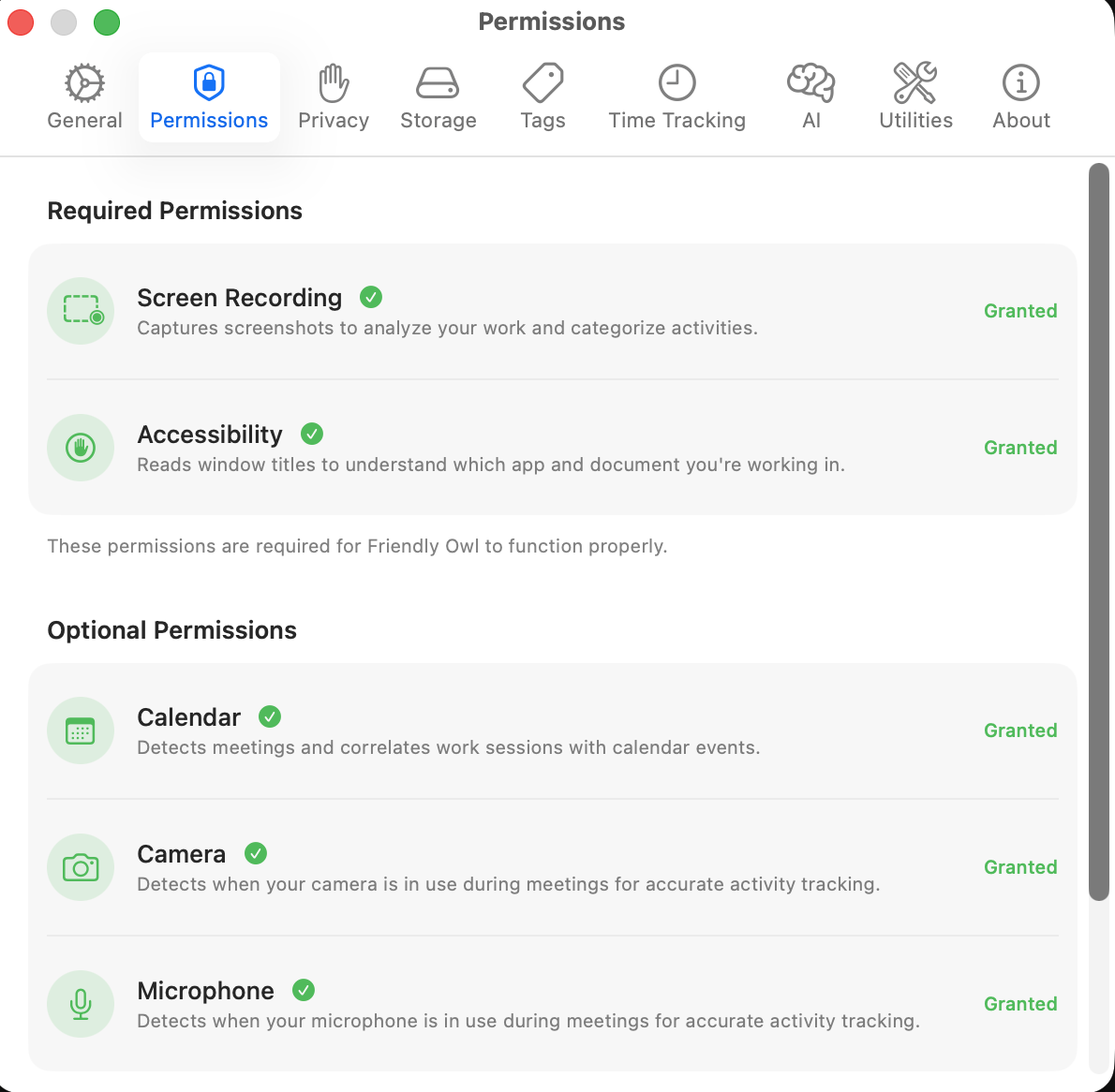 See required and optional macOS permissions in one place before you start relying on the app.