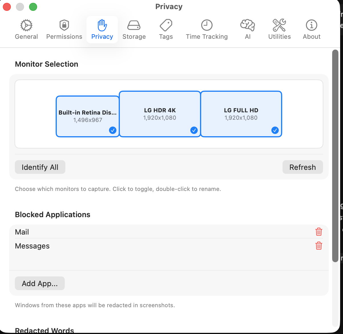 Choose monitors, block sensitive apps, and keep redaction controls close at hand.